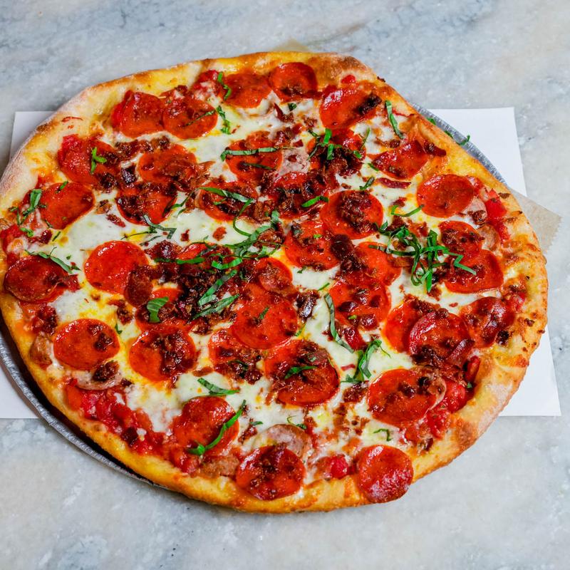 Regular $16.00 | Large $20.00 • Plum tomatoes, garlic, oregano, basil, parmesan, bacon, pepperoni, sausage, and mozzarella.